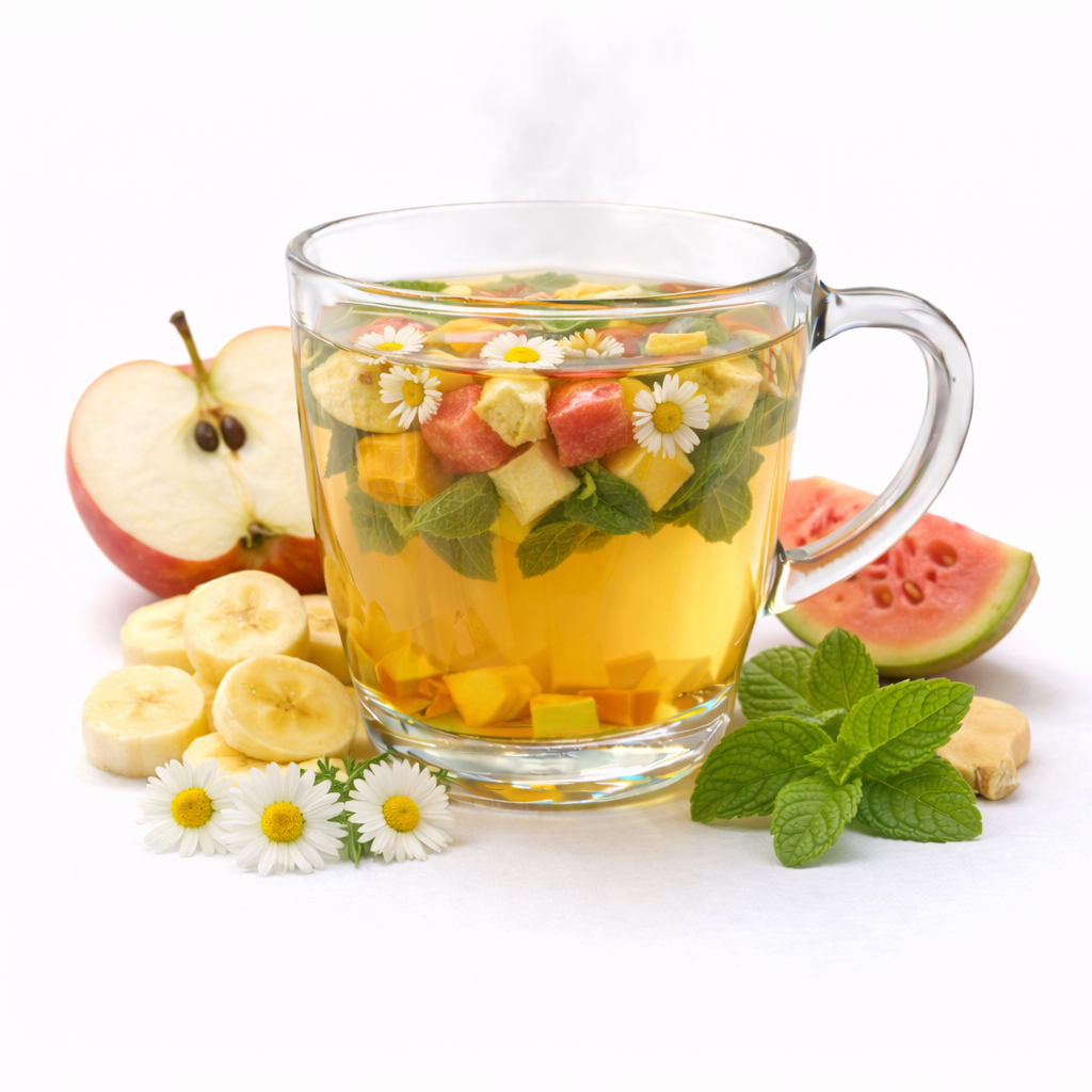 La manzana pone una base tipo compota (suave y cálida), la guayaba aporta identidad frutal colombiana y aroma, y el banano redondea con dulzor natural. Las hierbas hacen el resto: la manzanilla y el toronjil dan sensación de calma, y el jengibre, en dosis bajita, suma ese “calorcito” que muchas personas disfrutan cuando hay incomodidad.