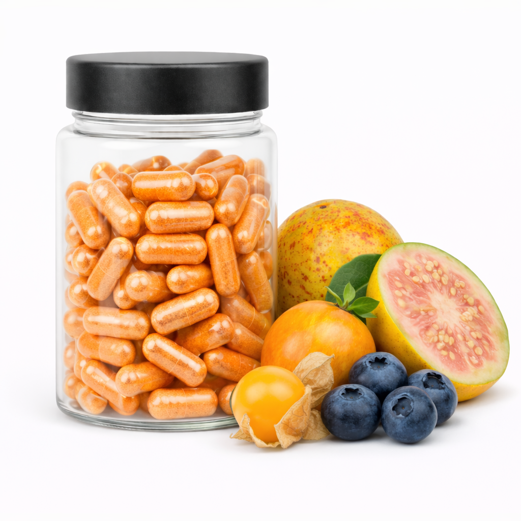 Esta fórmula reúne frutas con perfiles nutricionales muy valorados por su aporte de vitamina C y compuestos antioxidantes. En formato polvo, para que puedas integrarla fácil a tu día: en agua, jugos, smoothies, yogurt o bowls—sin pelar, sin licuar fruta fresca y sin desperdicio.