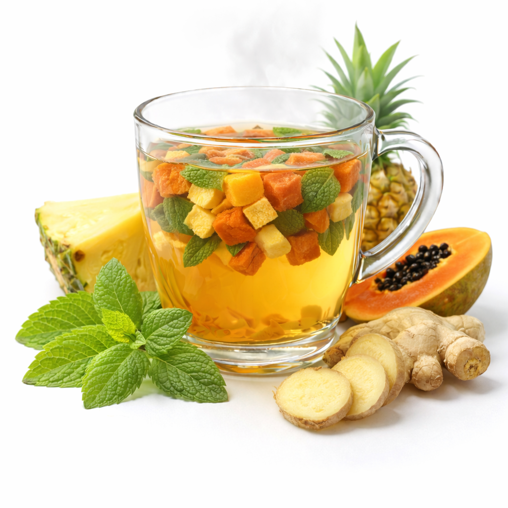 La fruta aporta un toque tropical amable y jugoso, mientras que las hierbas suman un final refrescante con un puntito picante. El resultado es una infusión ligera, vibrante y reconfortante.